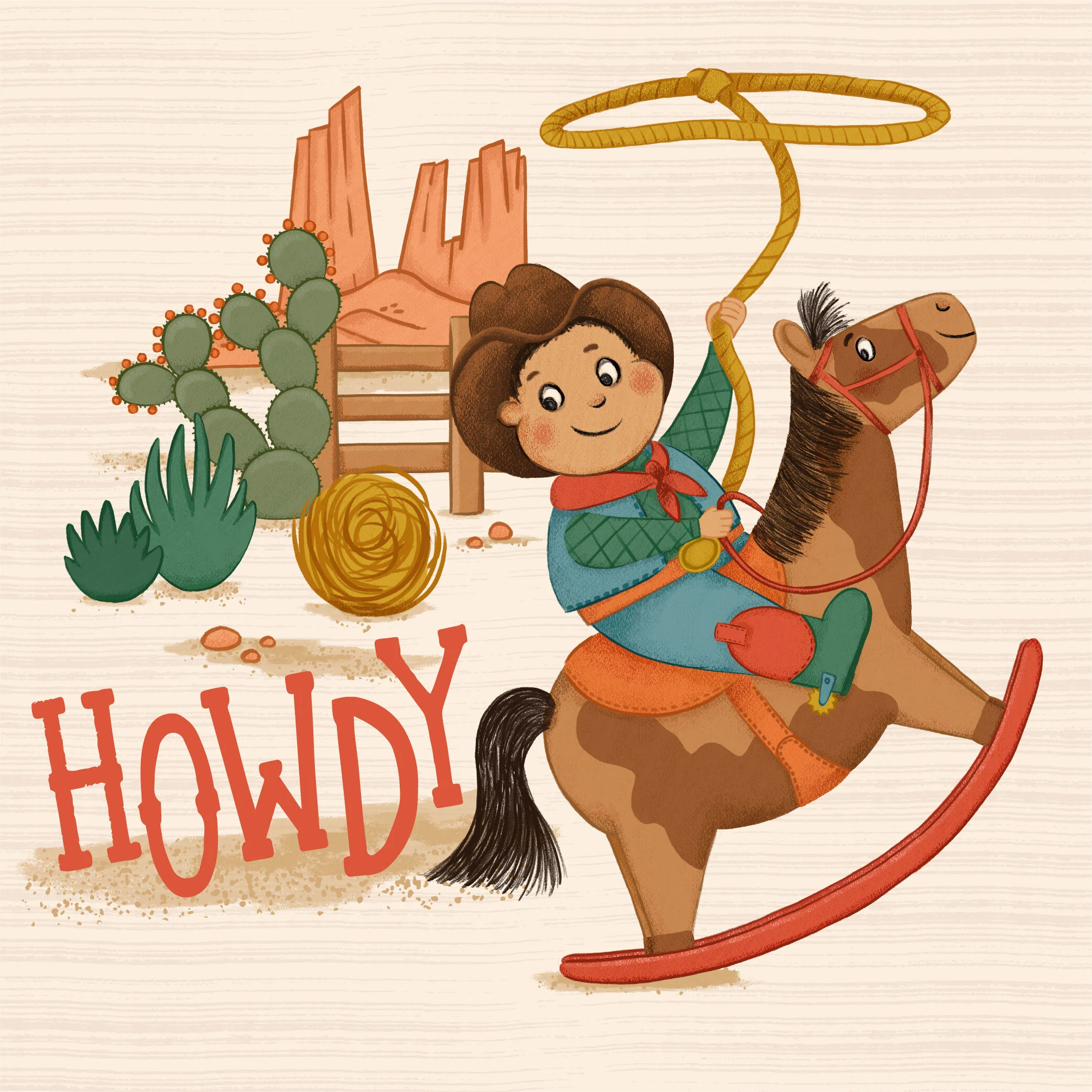 Yeehaw!!! Taking inspiration from 1950s children’s wallpaper with its charming scenes and endearing illustrations, this pattern is a refreshed approach to the ever evolving Americana trend.